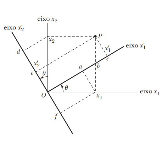 Com um conjunto de eixos x1, x2, x3, vamos agora efetuar uma rotação arbitrária sobre algum eixo através da origem. Na nova posição, rotulamos os eixos como x'1, x'2, x'3. A rotação